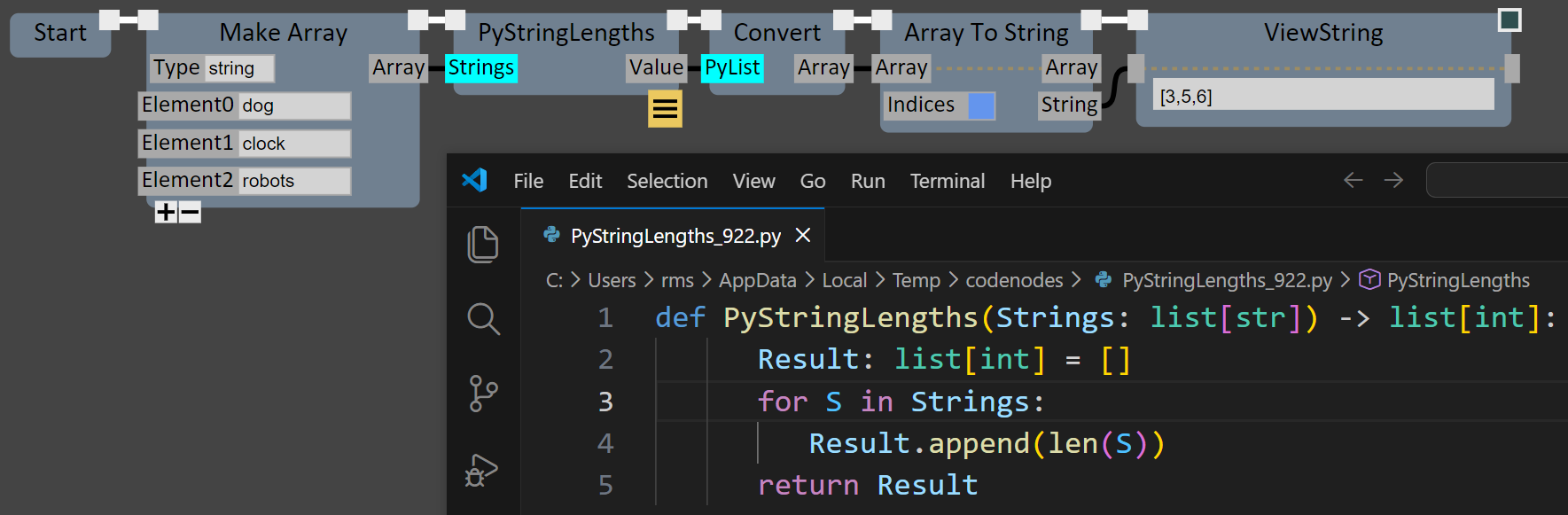 Python Code Nodes work the same way as C# Code Nodes, where the Python code is stored inside the Node, and edited in VSCode via automatically-managed temporary files. A simple example is shown below.