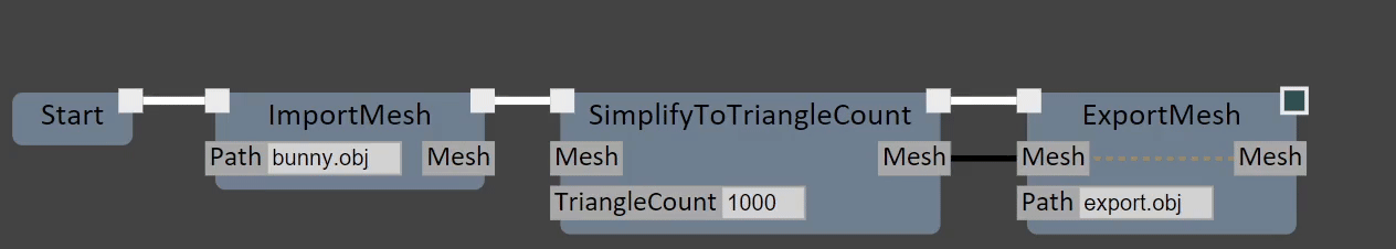 One of the great strengths of C# in this NodeGraph context is that, as long as the code being called is “managed” (ie C# that doesn’t use unsafe blocks, raw pointers, etc), any failure in a Node can be caught and surfaced to the user. In the example below, the output Mesh of ImportMesh is not connected to the SimplifyToTriangleCount. During evaluation, the node throws an Exception, which is caught and indicated with a red node and a hoverable exclamation-mark widget.