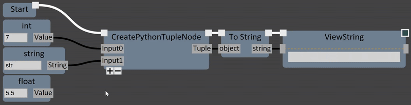 GSGraph also supports the concept of “Dynamic” node outputs, which change type depend on changes to the inputs. This is particularly useful for supporting Python interoperability. In the example below, the CreatePythonTupleNode creates a Python tuple based on the variable-length list of inputs to the Node. The types of the tuple elements are dynamically updated as the input pins (which are of C# type ‘object’) are rewired.