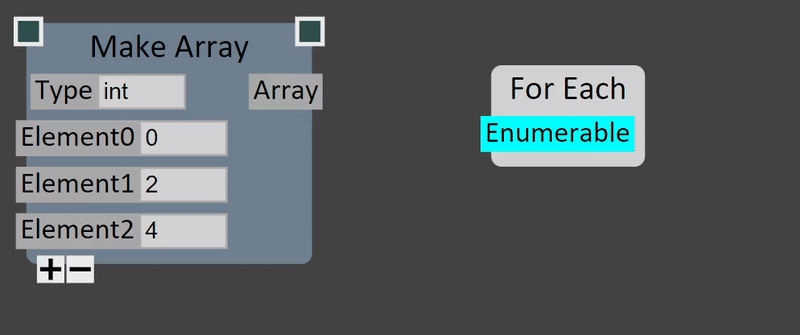GSGraph supports the concept of “Placeholder” Nodes, which allow the graph to be created without knowing explicit types up-front. This is particularly useful for handling C# generics. In the example on the right, a ForEach placeholder node has been placed. Any type that implements IEnumerable is a valid source for the placeholder’s input pin. Once an int[] output pin is connected, the Placeholder is automatically expanded into an explicit ForEach node that takes an IEnumerable<int> input.