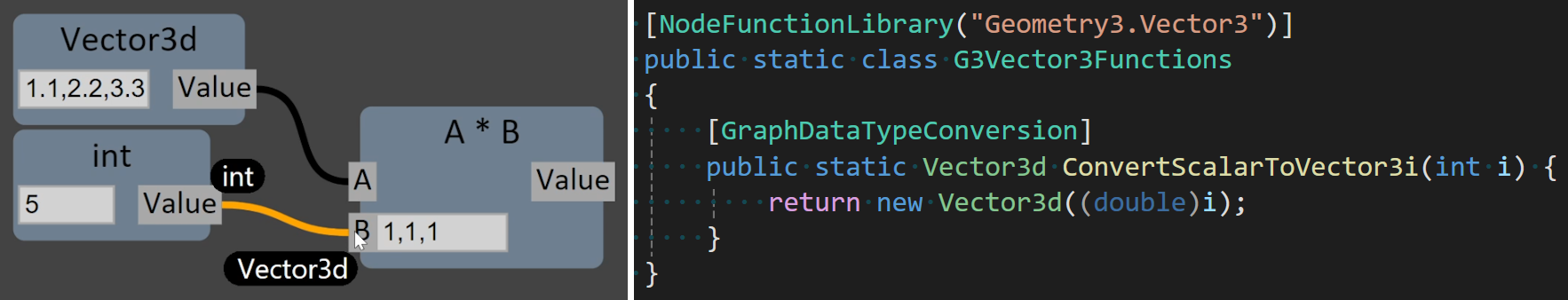 Converting between data types is one of the small annoyances that can make working with a NodeGraph feel tedious. GSGraph supports simple registration of type-conversion static functions similar to custom nodes - just tag the method with the [GraphDataTypeConversion] Attribute, as shown below-right.
