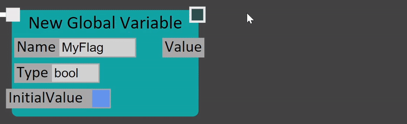 GSGraph supports explicit Variable definitions. A created Variable has a unique name, and a quick shortcut allows any output pin to be automatically wired into a New Global Variable node. Once defined, a variable can be accessed/updated with Get and Set nodes that “know” the name of their source variable, so that if the Name field is updated, all Get/Set nodes are automatically updated as well.