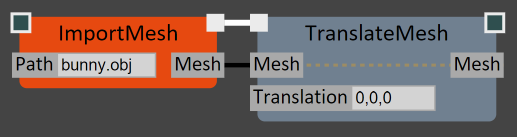 On Nodes defined by static functions, C# “ref” parameters will automatically be exposed as InOut pins. The connection between the input and output pin is visualized with a dashed line in the Node, as shown in the TranslateMesh node above.