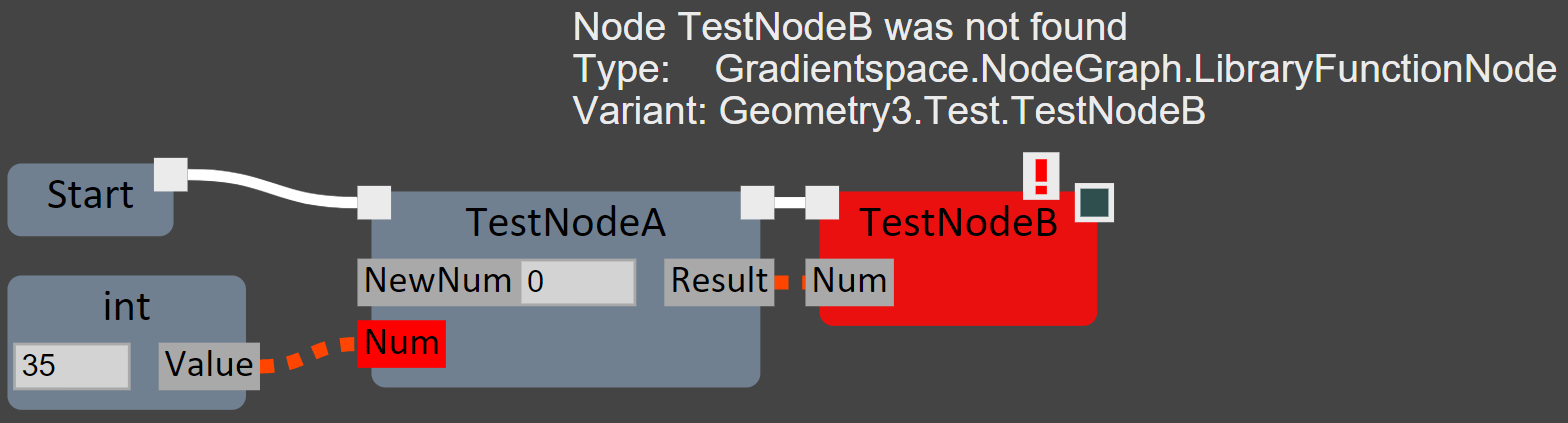 Errors can also occur when trying to load a saved graph if the underlying Node definitions have changed in some way (without proper Version handling - see the next section). In the example below, the file was saved with nodes defined as int TestNodeA(int Num) and TestNodeB(int Num). Then the TestNodeA parameter was renamed to NewNum, and TestNodeB was deleted, and the graph was reloaded. The missing node and missing/invalid data connection both remain in the graph, making it straightforward to identify what is wrong and fix it.
