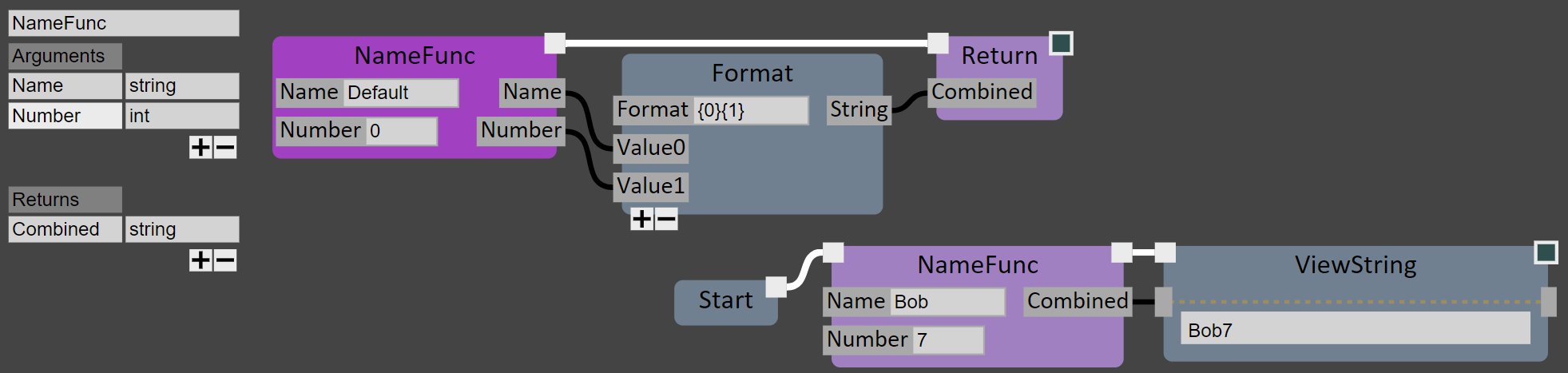 In addition to defining re-usable Nodes using compiled C# or inline CodeNodes, Functions can also be defined in the graph. These are sub-graphs that will be executed whenever they are called. In the example below I’ve defined a simple example function, called NameFunc, that takes string and int parameters, and creates a combined Name+Number string. An in-graph UI panel is used to configure the function, and Return nodes set the output-pin values. A call to NameFunc is shown in the bottom-right.