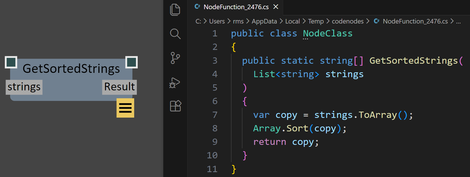 One of the most powerful features of GSNodeGraph is it’s support for Code Nodes, which are custom Graph Nodes that are defined by C# code that is stored as part of the Node and dynamically compiled on-the-fly using the Roslyn, the C# compiler SDK. A simple example is shown to the right, where the C# code for a function called GetSortedStrings is shown on the right, and the resulting Node is shown on the left. As the C# code is edited and saved, the graph node will automatically update.