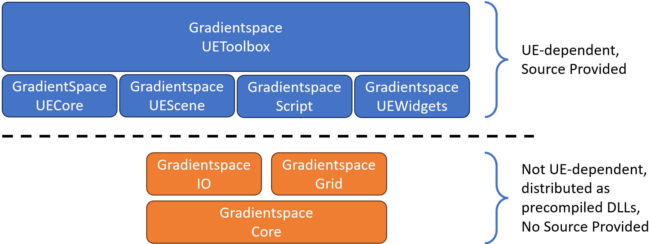 The image on the right illustrates this split, with the UE-dependent modules in blue and the Gradientspace Libraries in orange.
